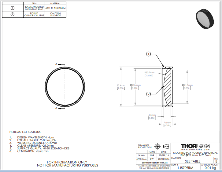 Thorlabs索雷博 LJ5709RM 平凸柱面透镜