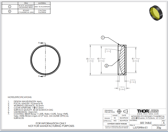 Thorlabs索雷博 LJ5709RM-E1 平凸柱面透镜