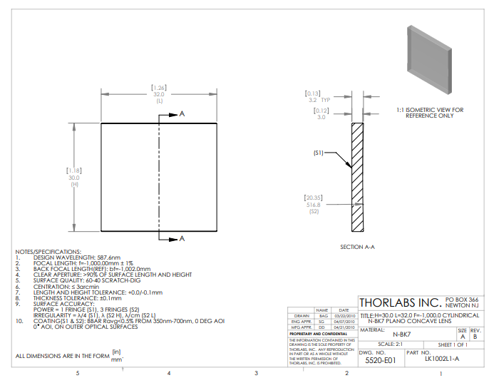 Thorlabs索雷博 LK1002L1-A 平凹柱面透镜
