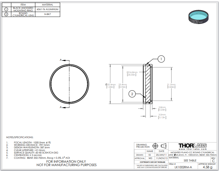 Thorlabs索雷博 LK1002RM-A 平凹圆形柱面透镜