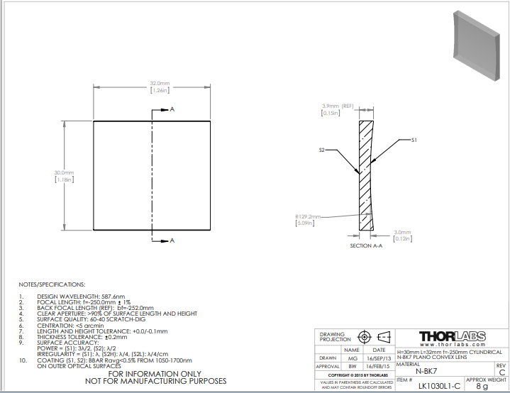 Thorlabs索雷博 LK1030L1-C 平凹柱面透镜
