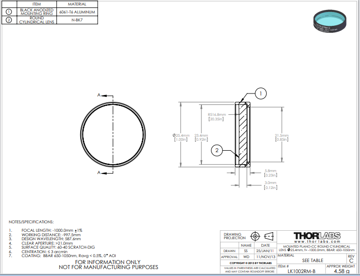 Thorlabs索雷博 LK1002RM-B 平凹圆形柱面透镜