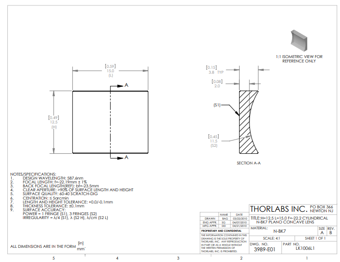 Thorlabs索雷博     LK1006L1   平凹柱面透镜