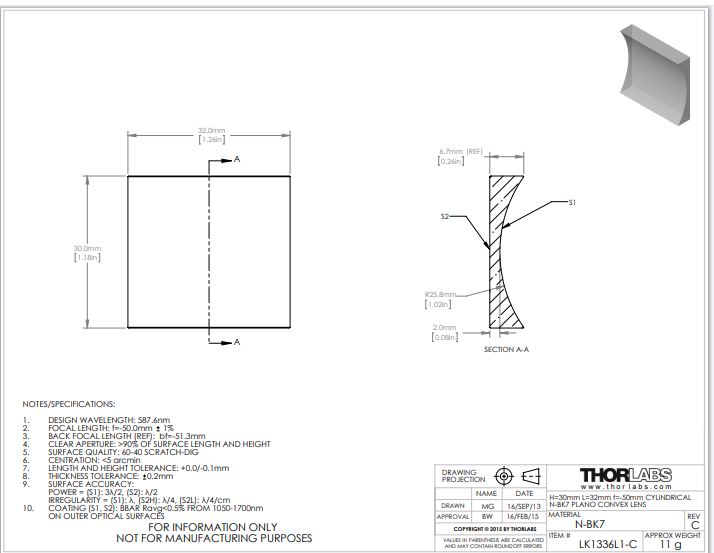 Thorlabs索雷博     LK1336L1-C 平凹柱面透镜