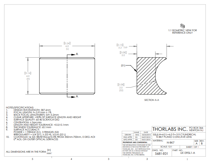 Thorlabs索雷博 LK1395L1-A 平凹柱面透镜