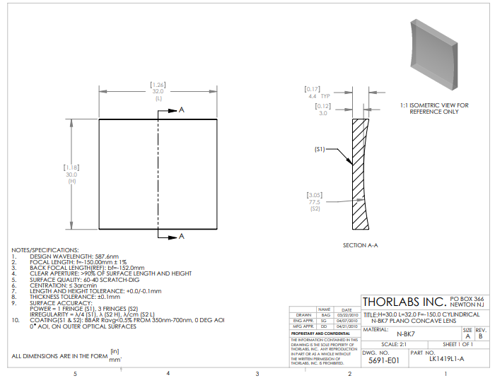 Thorlabs索雷博     LK1419L1-A   平凹柱面透镜