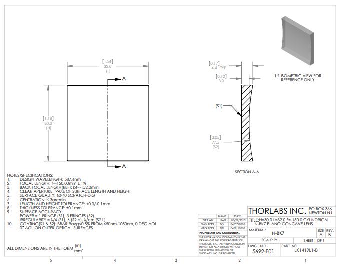 Thorlabs索雷博 LK1419L1-B 平凹柱面透镜