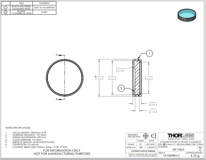 Thorlabs索雷博     LK1069RM-C   平凹圆形柱面透镜