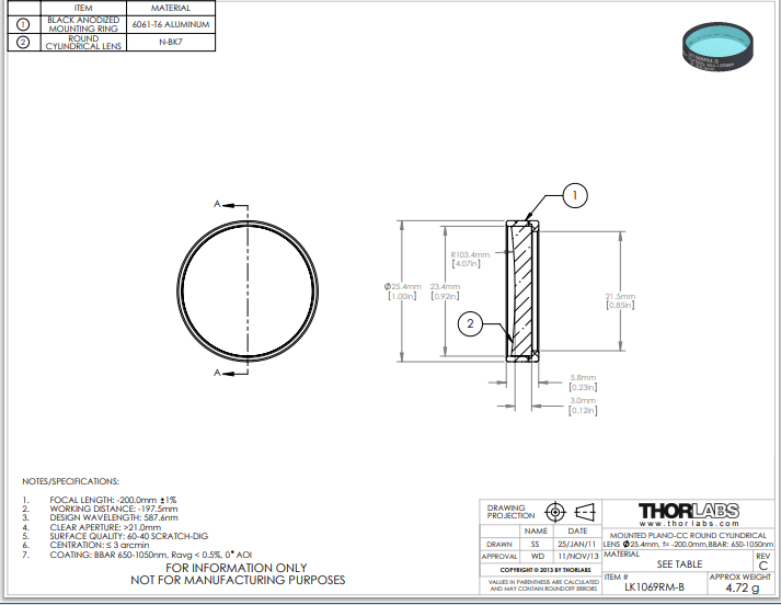 Thorlabs索雷博 LK1069RM-B 平凹圆形柱面透镜