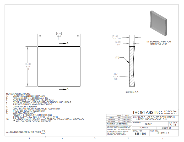 Thorlabs索雷博 LK1069L1-B 平凹柱面透镜