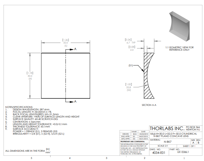 Thorlabs索雷博 LK1336L1 平凹柱面透镜