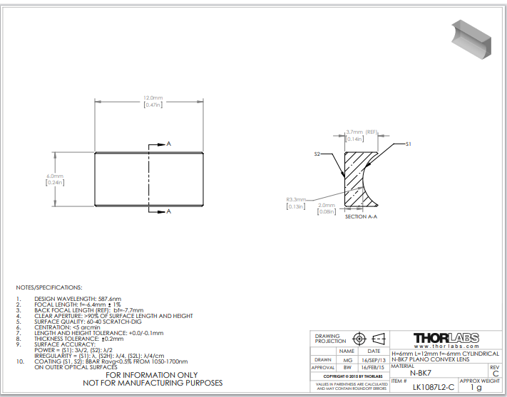 Thorlabs索雷博 LK1087L2-C 平凹柱面透镜