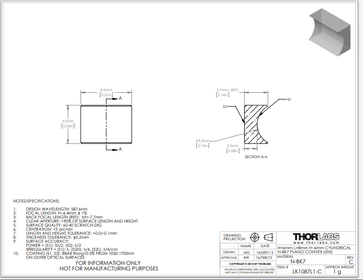 Thorlabs索雷博 LK1087L1-C 平凹柱面透镜