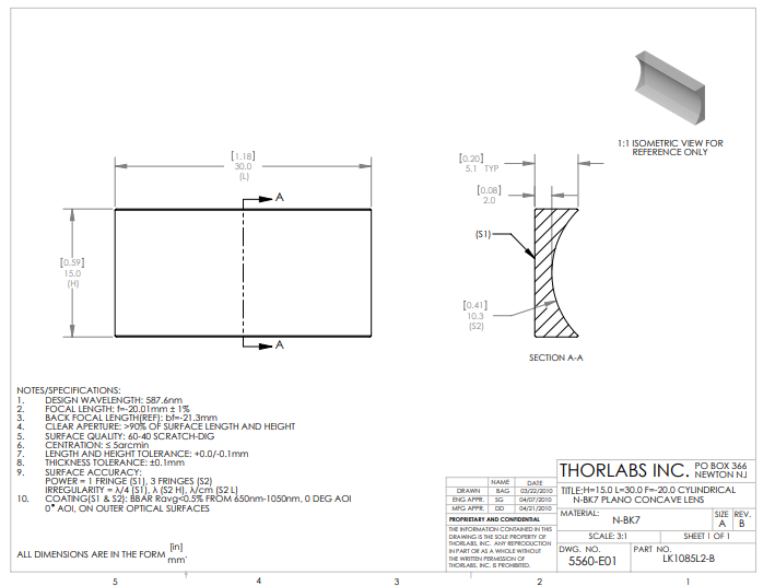 Thorlabs索雷博 LK1085L2-B 平凹柱面透镜