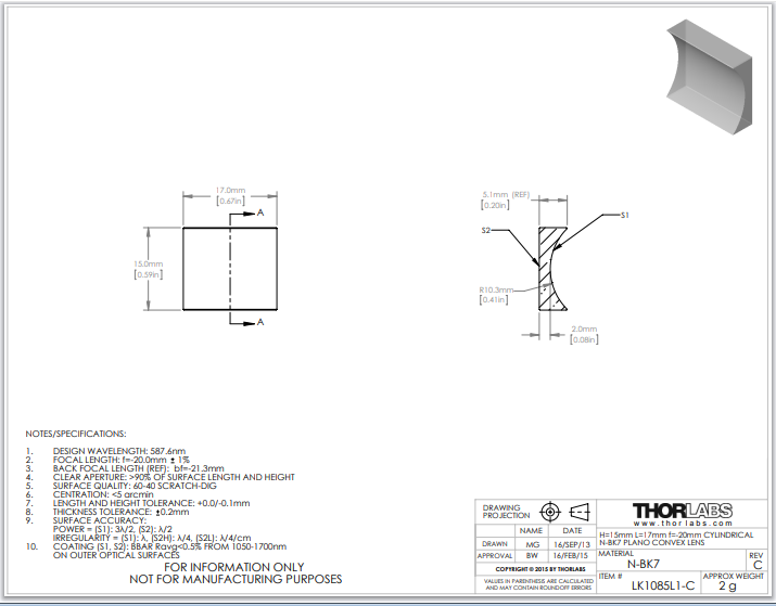 Thorlabs索雷博     LK1085L1-C 平凹柱面透镜