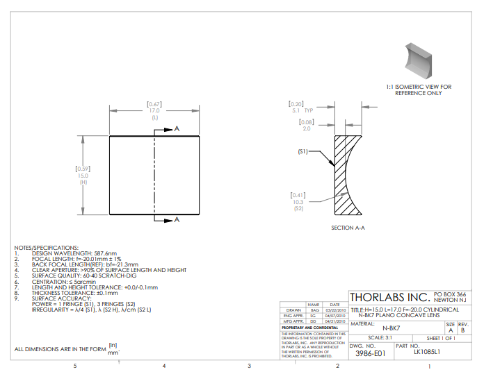 Thorlabs索雷博 LK1085L1 平凹柱面透镜