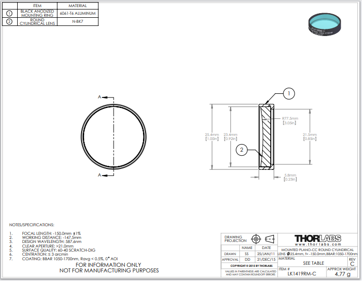 Thorlabs索雷博 LK1419RM-C 平凹圆形柱面透镜