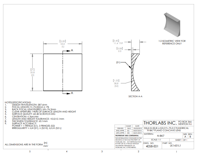 Thorlabs索雷博 LK1431L1 平凹柱面透镜