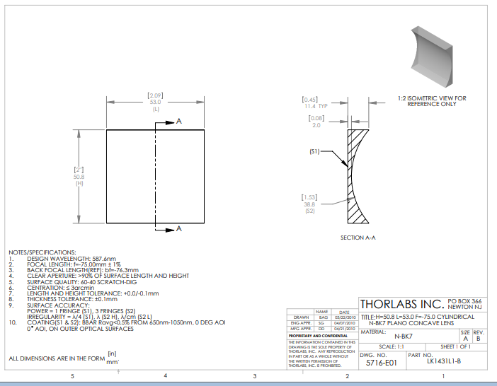 Thorlabs索雷博     LK1431L1-B   平凹柱面透镜