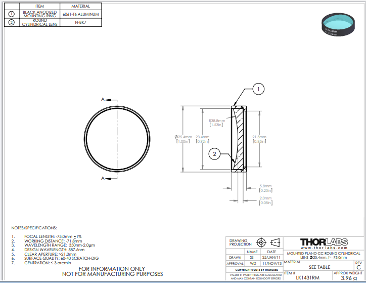 Thorlabs索雷博 LK1431RM 平凹圆形柱面透镜