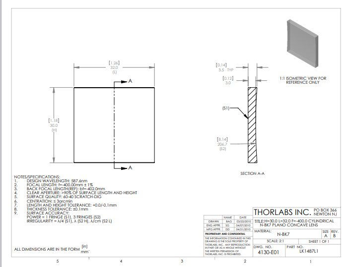 Thorlabs索雷博     LK1487L1   平凹柱面透镜
