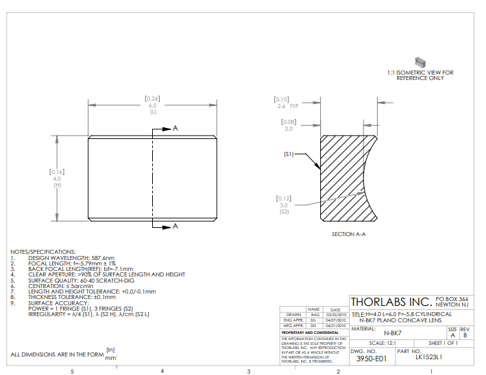 Thorlabs索雷博 LK1523L1 平凹柱面透镜