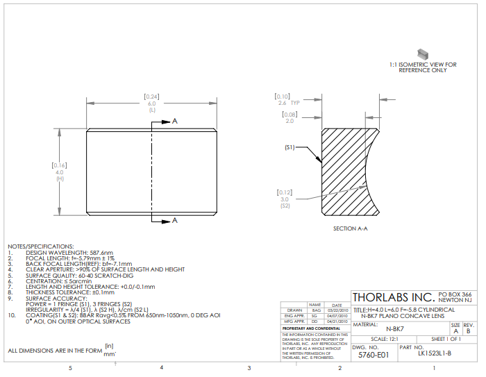 Thorlabs索雷博 LK1523L1-B 平凹柱面透镜