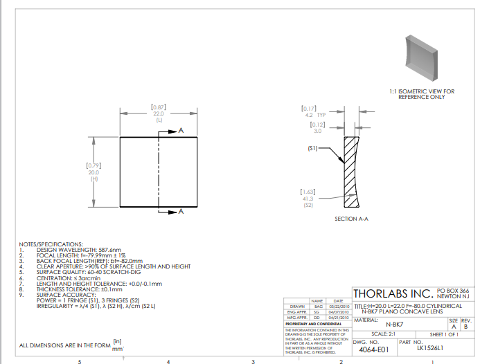 Thorlabs索雷博 LK1526L1 平凹柱面透镜