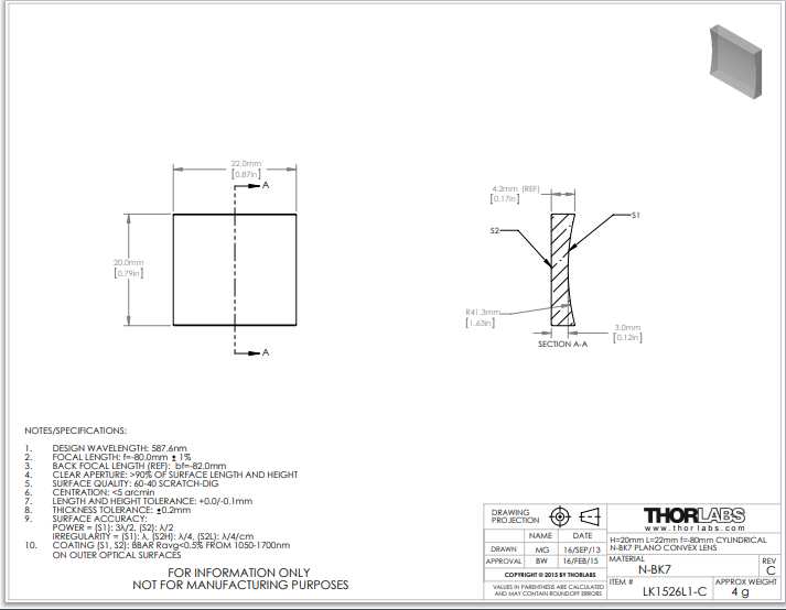 Thorlabs索雷博 LK1526L1-C 平凹柱面透镜