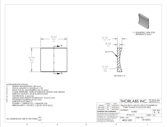 Thorlabs索雷博 LK1662L1 平凹柱面透镜