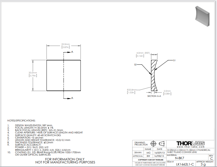 Thorlabs索雷博 LK1662L1-C 平凹柱面透镜