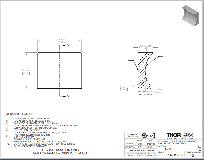 Thorlabs索雷博 LK1684L1-C 平凹柱面透镜