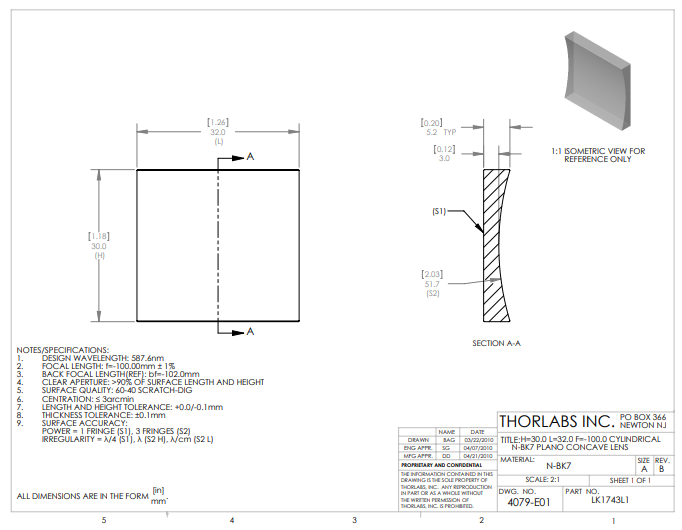 Thorlabs索雷博 LK1743L1 平凹柱面透镜