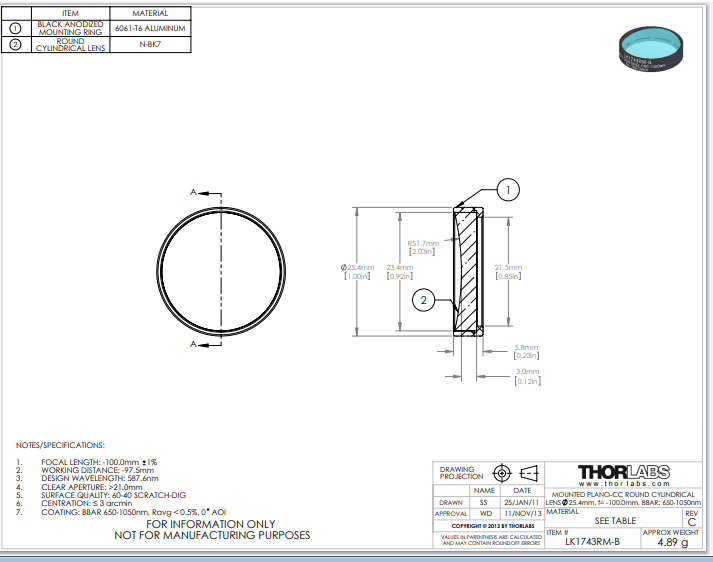 Thorlabs索雷博     LK1743RM-B   平凹圆形柱面透镜