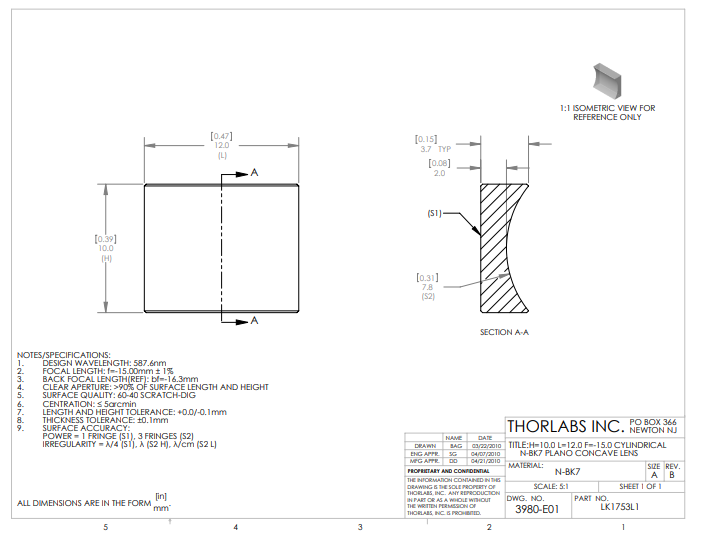 Thorlabs索雷博 LK1753L1 平凹柱面透镜