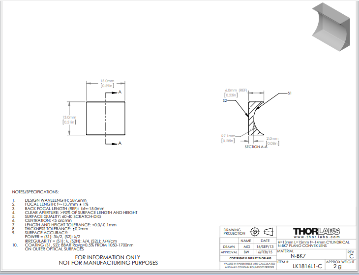 Thorlabs索雷博 LK1816L1-C 平凹柱面透镜