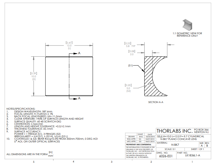 Thorlabs索雷博 LK1836L1-A 平凹柱面透镜