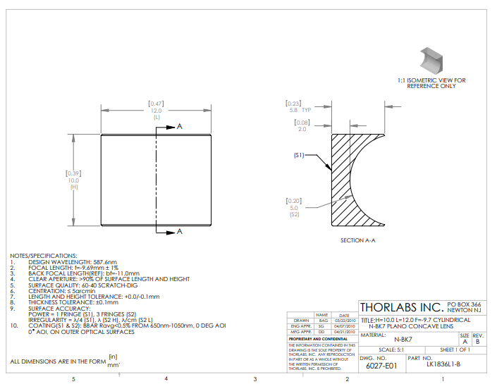 Thorlabs索雷博 LK1836L1-B 平凹柱面透镜
