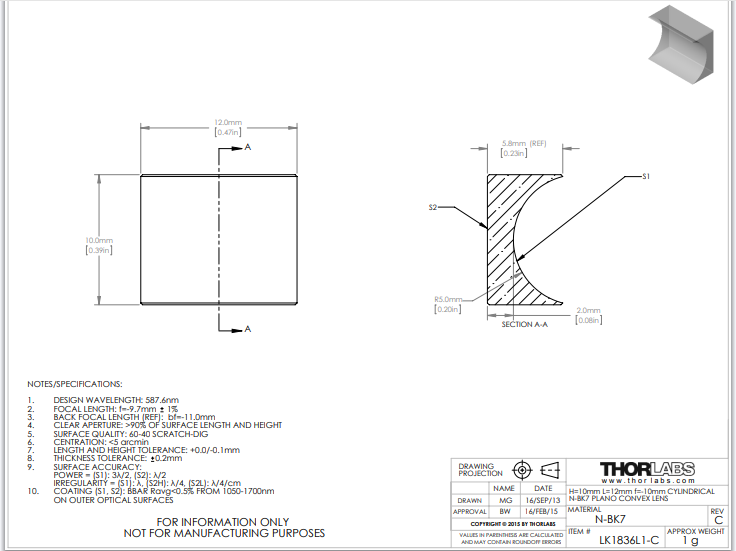 Thorlabs索雷博 LK1836L1-C 平凹柱面透镜
