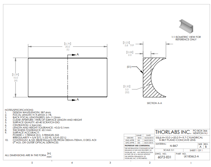 Thorlabs索雷博 LK1836L2-A 平凹柱面透镜