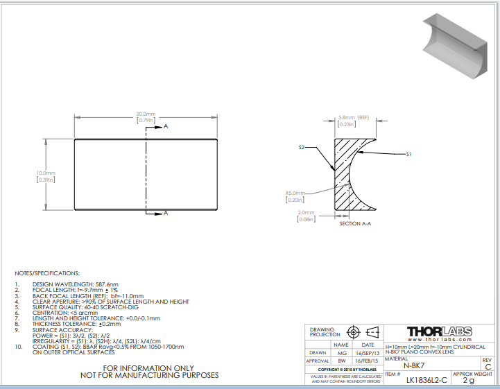 Thorlabs索雷博 LK1836L2-C 平凹柱面透镜