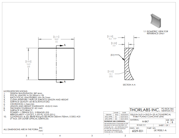 Thorlabs索雷博 LK1900L1-A 平凹柱面透镜