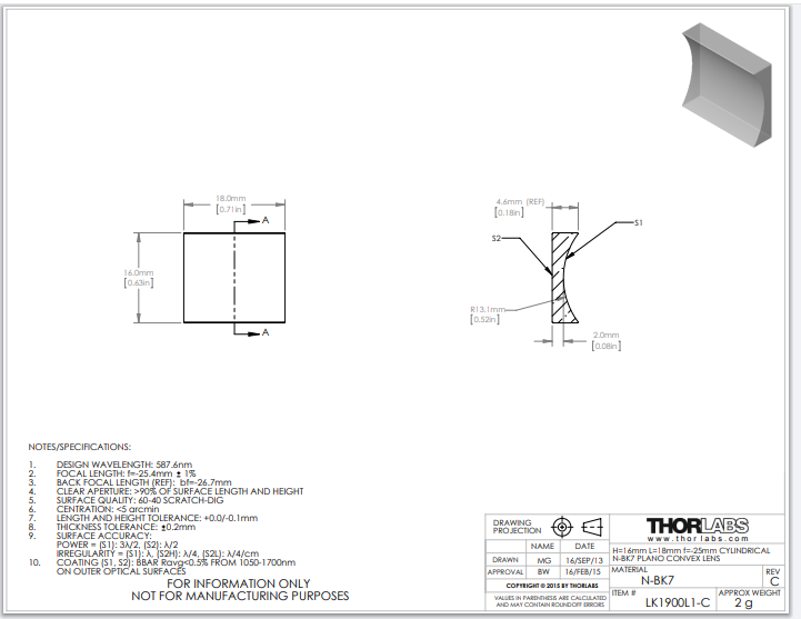 Thorlabs索雷博 LK1900L1-C 平凹柱面透镜