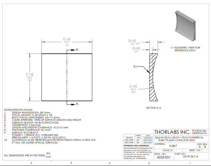 Thorlabs索雷博 LK1913L1-A 平凹柱面透镜