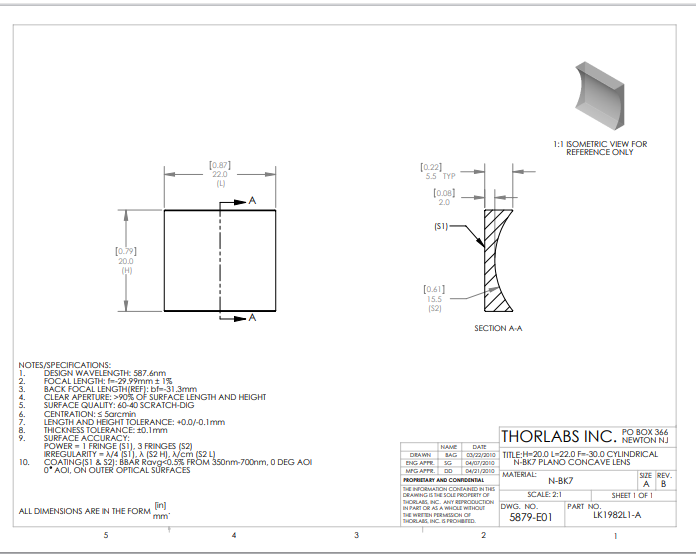 Thorlabs索雷博     LK1982L1-A   平凹柱面透镜