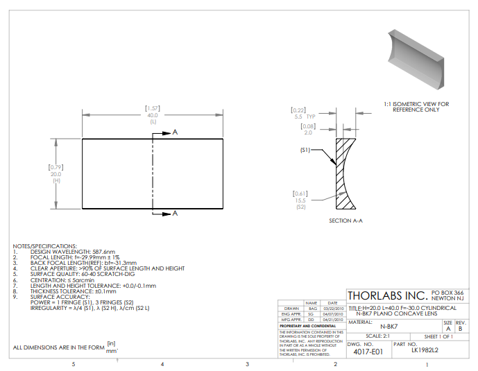 Thorlabs索雷博 LK1982L2 平凹柱面透镜