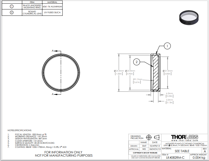 Thorlabs索雷博 LK4082RM-C 平凹圆形柱面透镜