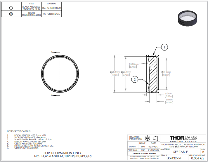 Thorlabs索雷博 LK4432RM 平凹圆形柱面透镜