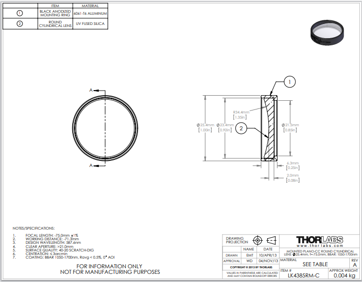 Thorlabs索雷博 LK4385RM-C 平凹圆形柱面透镜