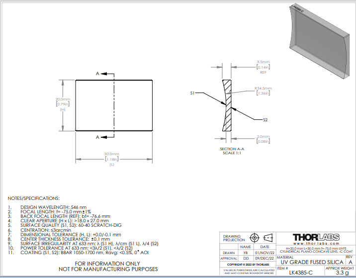 Thorlabs索雷博 LK4385-C 平凹柱面透镜